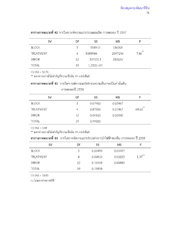 ตารางภาคผนวกที่ 42 การวิเคราะห์ความแปรปรวนผลผลิต การทดลอง ปี 2557