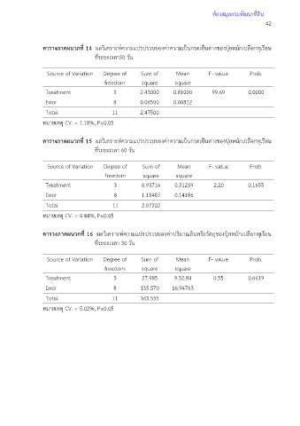 ตารางภาคผนวกที่ 16 ผลวิเคราะห์ความแปรปรวนของค่าปริมาณอินทรียวัตถุของปุ๋ยหมักเปลือกทุเรียน