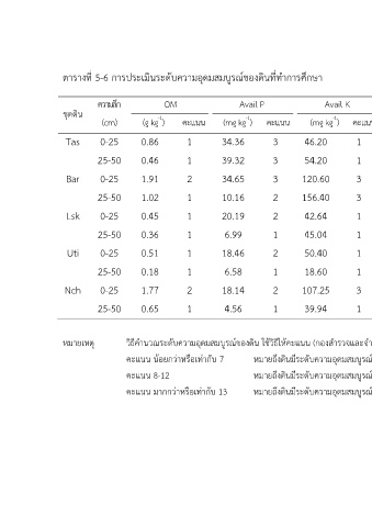 ตารางที่ 5-6 การประเมินระดับความอุดมสมบูรณของดินที่ทําการศึกษา