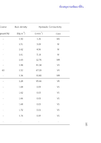 Series Depth Horizon Particle size distribution (g kg ) Textural Coarse Bulk density Hydraulic Conductivity