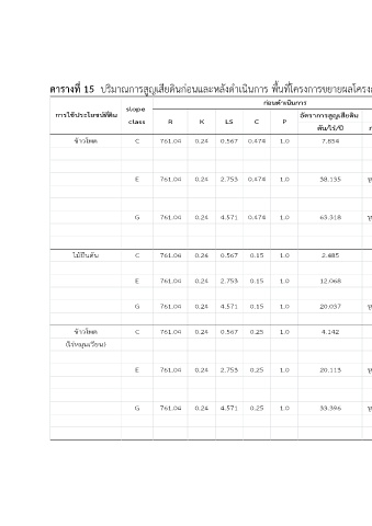 ตารางที่ 15 ปริมาณการสูญเสียดินก่อนและหลังด่าเนินการ พื้นที่โครงการขยายผลโครงการหลวงวาวี บ้านดอยช้าง ต่าบลวาวี อ่าเภอแม่สรวย จังหวัดเชียงราย