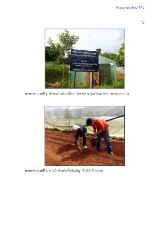 ห้องสมุดกรมพัฒนาที่ดิน 70 ภาพภาคผนวกที่ 1 ลักษณะโรงเรือนที่ท าการทดลอง ณ ศูนย์พัฒนาโครงการหลวงทุ่งหลวง ภาพภาคผนวกที่ 2 การเก็บตัวอย่างดินก่อนปลูกเพื่อน าไปวิเคราะห์