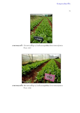 ห้องสมุดกรมพัฒนาที่ดิน 73 ภาพภาคผนวกที่ 7 ผักกาดหวานที่ปลูก ณ โรงเรือนของศูนย์พัฒนาโครงการหลวงทุ่งหลวง ปี พ.ศ. 2557 ภาพภาคผนวกที่ 8 ผักกาดหวานที่ปลูก ณ โรงเรือนของศูนย์พัฒนาโครงการหลวงทุ่งหลวง ปี พ.ศ. 2558