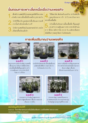 เพาะเลี้ยงเนื้อเยื่อที่อุณหภูมิ 25-28 C โปรโตคอมร์ม 30-40 วัน สังเคราะห์สูตร เพิ่ม BA