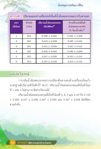 ตารางที่ 2 ปริมาณและค่าเฉลี่ยเปอร์เซ็นต์นำ้ามันหอมระเหยจากใบตานหก