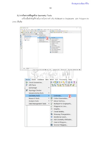 ห้องสมุดกรมพัฒนาที่ดิน 94 5.2 การวิเคราะห์ข้อมูลด้วย Geometry Tools เครื่องมือสำคัญที่ช่วยในการวิเคราะห์ เช่น Multipart to Singleparts และ Polygons to Lines เป็นต้น