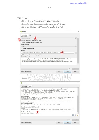 ห้องสมุดกรมพัฒนาที่ดิน 104 ในหน้าต่าง Merge 4) Input layers เลือกไฟล์ข้อมูลภาพที่ต้องการรวมกัน 5) คลิกเลือกช่อง Grab pseudocolor table from first layer 6) Merged เลือกโฟลเดอร์ที่ต้องการเก็บ และตั้งชื่อไฟล์ *.tif 7) คลิก Run