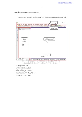 Graphic User Interface ของโปรแกรม QGIS มีส่วนประกอบของหน้าจอหลักๆ ดังนี้