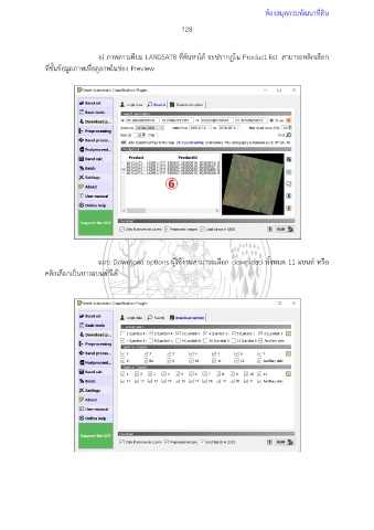 ห้องสมุดกรมพัฒนาที่ดิน 128 6) ภาพดาวเทียม LANDSAT8 ที่ค้นหาได้ จะปรากฏใน Product list สามารถคลิกเลือก ที่ชั้นข้อมูลภาพเพื่อดูภาพในช่อง Preview แถบ Download options ผู้ใช้งานสามารถเลือก download ทั้งหมด 11 แบนด์ หรือ คลิกเลือกเป็นบางแบนด์ก็ได้