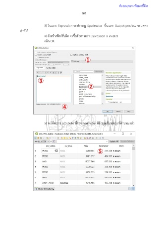 ห้องสมุดกรมพัฒนาที่ดิน 161 3) ในแถบ Expression จะปรากฏ $perimeter ขึ้นและ Output preview จะแสดง ค่าที่ได้ 4) ถ้าสร้างฟังก์ชั่นผิด จะขึ้นข้อความว่า Expression is invalid คลิก OK 5) จะได้ตาราง attribute ที่ช่อง Perimeter มีข้อมูลเส้นรอบรูปที่คำนวณแล้ว