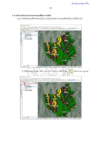 ห้องสมุดกรมพัฒนาที่ดิน 166 8 การสร้างองค์ประกอบต่างๆของแผนที่และการพิมพ์ ก่อนการจัดพิมพ์แผนที่ต้องปรับแต่งรูปแบบสัญลักษณ์ต่างๆของแผนที่ตามต้องการให้เรียบร้อย 1) ไปที่แถบเมนู Project เลือก New Print Layout หรือคลิกปุ่ม New Print Layout
