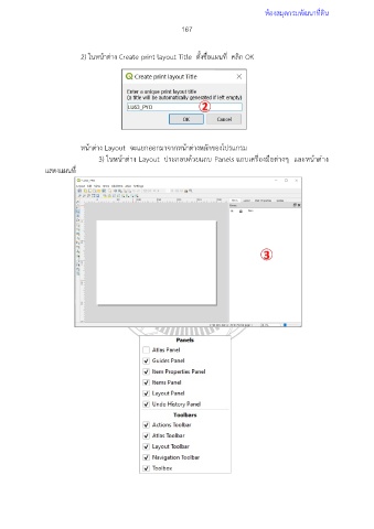 ห้องสมุดกรมพัฒนาที่ดิน 167 2) ในหน้าต่าง Create print layout Title ตั้งชื่อแผนที่ คลิก OK หน้าต่าง Layout จะแยกออกมาจากหน้าต่างหลักของโปรแกรม 3) ในหน้าต่าง Layout ประกอบด้วยแถบ Panels แถบเครื่องมือต่างๆ และหน้าต่าง แสดงแผนที่