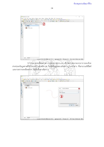 ห้องสมุดกรมพัฒนาที่ดิน 24 3) โปรแกรมจะขึ้นหน้าต่าง Feature Attributes เพื่อให้เราสามารถกรอกรายละเอียด ต่างๆของข้อมูลตามที่ได้กำหนดไว้ แล้วคลิก OK ก็จะได้ข้อมูลแบบเส้นปรากฏในหน้าต่าง ซึ่งสามารถดิจิไตซ์ และกรอกรายละเอียดต่างๆ ได้เพิ่มขึ้นตามต้องการ