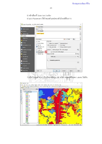 ห้องสมุดกรมพัฒนาที่ดิน 43 5) คลิกเลือกที่ Draw text buffer 6) แถบ Placement ใช้กำหนดตำแหน่งของตัวอักษรที่ต้องการ 7) เมื่อกำหนดค่าต่างๆ เรียบร้อย คลิกปุ่ม OK จะได้ภาพแผนที่ที่แสดง Labels ให้เห็น