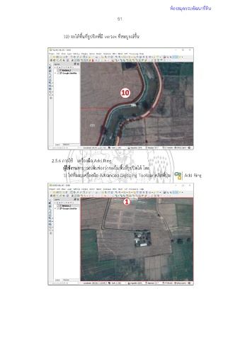 ห้องสมุดกรมพัฒนาที่ดิน 51 10) จะได้พื้นที่รูปปิดที่มี vertex ที่สมบูรณ์ขึ้น 2.5.6 การใช้ เครื่องมือ Add Ring ผู้ใช้งานสามารถเพิ่มช่องว่างลงในพื้นที่รูปปิดได้ โดย 1) ไปที่แถบเครื่องมือ Advanced Digitizing Toolbar คลิกที่ปุ่ม Add Ring