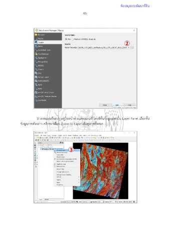 ห้องสมุดกรมพัฒนาที่ดิน 65 3) ภาพแผนที่จะปรากฏในหน้าต่างแสดงแผนที่ โดยที่ชั้นข้อมูลแสดงใน Layer Panel เลือกชั้น ข้อมูลภาพดังกล่าว คลิกขวาเลือก Zoom to Layer เพื่อดูภาพทั้งหมด