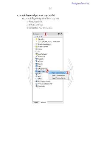 ห้องสมุดกรมพัฒนาที่ดิน 68 3.3 การเพิ่มข้อมูลแผนที่ฐาน (Base Map) ออนไลน์ 3.3.1 การเพิ่มข้อมูลแผนที่ฐานด้วยวิธีการ XYZ Tiles 1) ที่ Browser Panel 2) ไปที่แถบ XYZ Tiles 3) คลิกขวาเลือก New Connection