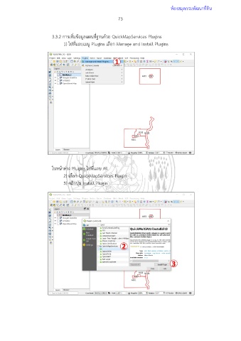 ห้องสมุดกรมพัฒนาที่ดิน 73 3.3.2 การเพิ่มข้อมูลแผนที่ฐานด้วย QuickMapServices Plugins 1) ไปที่แถบเมนู Plugins เลือก Manage and Install Plugins ในหน้าต่าง Plugins ไปที่แถบ All 2) เลือก QuickMapServices Plugin 3) คลิกปุ่ม Install Plugin