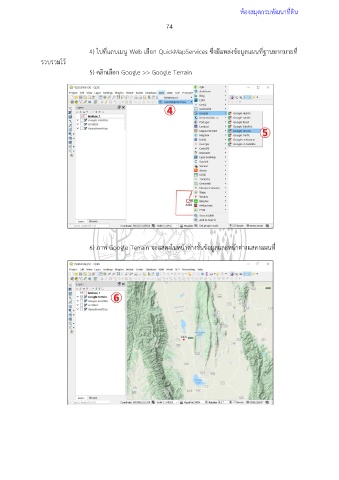 ห้องสมุดกรมพัฒนาที่ดิน 74 4) ไปที่แถบเมนู Web เลือก QuickMapServices ซึ่งมีแหล่งข้อมูลแผนที่ฐานมากมายที่ รวบรวมไว้ 5) คลิกเลือก Google >> Google Terrain 6) ภาพ Google Terrain จะแสดงในหน้าต่างชั้นข้อมูลและหน้าต่างแสดงแผนที่