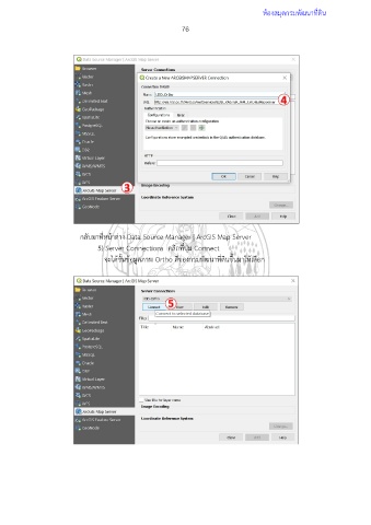 ห้องสมุดกรมพัฒนาที่ดิน 76 กลับมาที่หน้าต่าง Data Source Manager | ArcGIS Map Server 5) Server Connections คลิกที่ปุ่ม Connect จะได้ชั้นข้อมูลภาพ Ortho สีของกรมพัฒนาที่ดินขึ้นมาให้เลือก