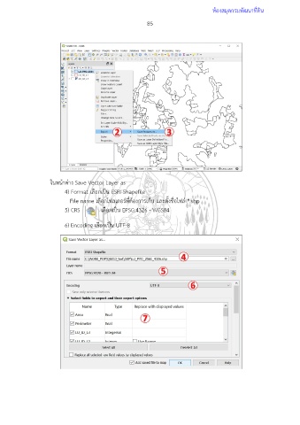 ห้องสมุดกรมพัฒนาที่ดิน 85 ในหน้าต่าง Save Vector Layer as 4) Format เลือกเป็น ESRI Shapefile File name เลือกโฟลเดอร์ที่ต้องการเก็บ และตั้งชื่อไฟล์ *.shp 5) CRS เลือกเป็น EPSG:4326 - WGS84 6) Encoding เลือกเป็น UTF-8