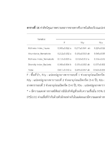 ตารางที่ 16 ค่าดัชนีคุณภาพความหลากหลายทางชีวภาพในดินบริเวณแปลงวิจัย อำเภอบ้านนาสาร จังหวัดสุราษฎร์ธานี
