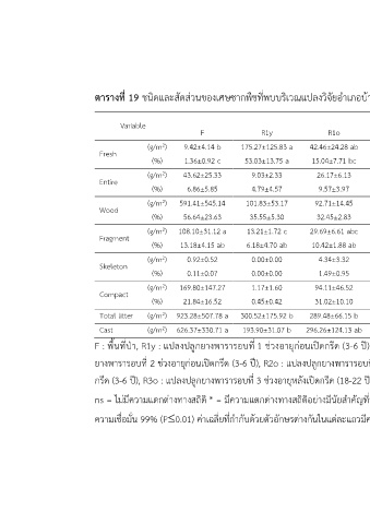 ตารางที่ 19 ชนิดและสัดส่วนของเศษซากพืชที่พบบริเวณแปลงวิจัยอำเภอบ้านนาสาร จังหวัดสุราษฎร์ธานี