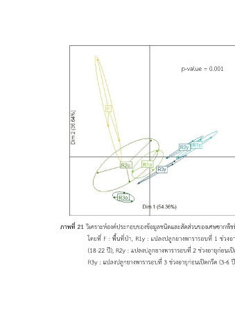 โดยที่ F : พื้นที่ป่า, R1y : แปลงปลูกยางพารารอบที่ 1 ช่วงอายุก่อนเปิดกรีด (3-6 ปี), R1o : แปลงปลูกยางพารารอบที่ 1 ช่วงอายุหลังเปิดกรีด