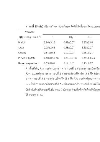 ตารางที่ 25 (ต่อ) ปริมาณก๊าซคาร์บอนไดออกไซด์ที่เกิดขึ้นจากกิจกรรมของจุลินทรีย์บริเวณแปลงวิจัยอำเภอบ้านนาสาร จังหวัดสุราษฎร์ธานี