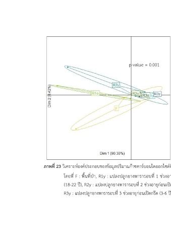 โดยที่ F : พื้นที่ป่า, R1y : แปลงปลูกยางพารารอบที่ 1 ช่วงอายุก่อนเปิดกรีด (3-6 ปี), R1o : แปลงปลูกยางพารารอบที่ 1 ช่วงอายุหลังเปิดกรีด