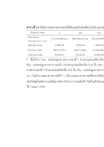 ตารางที่ 10 ดัชนีความหลากหลายของไส้เดือนฝอยในดินที่พบในบริเวณแปลงวิจัย อำเภอบ้านนาสาร จังหวัดสุราษฎร์ธานี
