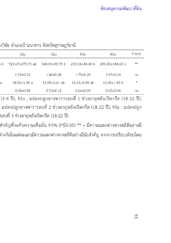 R2y : แปลงปลูกยางพารารอบที่ 2 ช่วงอายุก่อนเปิดกรีด (3-6 ปี), R2o : แปลงปลูกยางพารารอบที่ 2 ช่วงอายุหลังเปิดกรีด (18-22 ปี), R3y : แปลงปลูก
