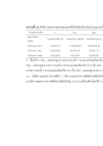 ตารางที่ 12 ดัชนีความหลากหลายของแบคทีเรียในดินที่พบในบริเวณแปลงวิจัย อำเภอบ้านนาสาร จังหวัดสุราษฎร์ธานี