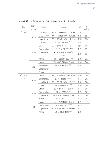 ตารางที่ 15 ความสัมพันธ์ระหว่างค่าดัชนีพืชพรรณกับค่าการน าไฟฟ้าของดิน