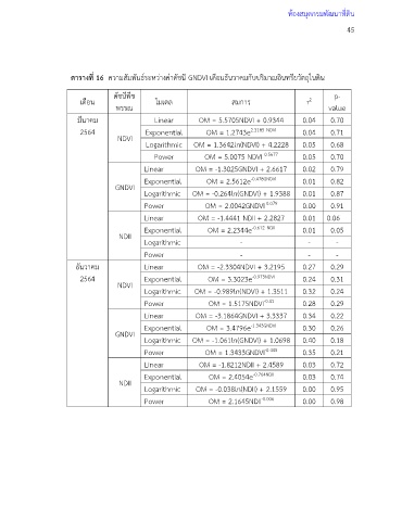 ตารางที่ 16 ความสัมพันธ์ระหว่างค่าดัชนี GNDVI เดือนธันวาคมกับปริมาณอินทรียวัตถุในดิน