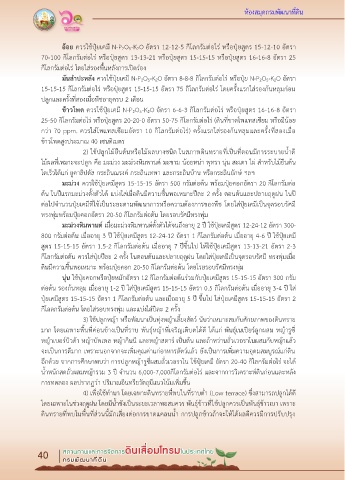 กิโลลกรัมต่อต้น โดยใส่รอบทรงพุ่ม และแบ่งใส่ปีละ 2 ครั้ง ทั้งนี้เนื่องจากความสามารถในการอุ้มน้ าของดินต่ าและอัตราการซึมผ่านของน้ าในดินชนิดนี้สูงมาก ฉะนั้น