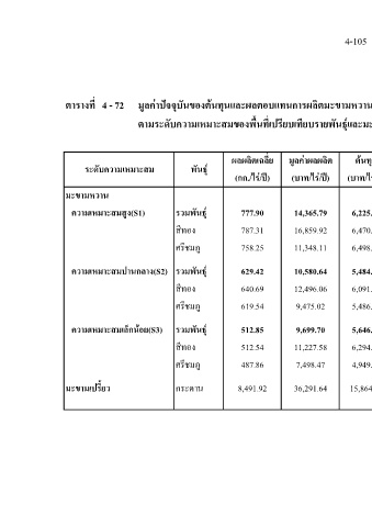 4-105 ระยะคืนทุน อัตราผลตอบแทน ผลตอบแทน นทุน ต (ปที่) ตอการลงทุน(B/C) (บาท/ไร/ป) (บาท/ไร/ป) 5 1.15 7,169.42 6,225.20 5 1.61 10,389.55 6,470.37 5 0.75 4,849.79 6,498.32 5 0.93 5,096.14 5,484.50 5 1.05 6,404.70 6,091.35 6 0.73 3,988.63 5,486.39 6 0.72 4,053.25 5,646.45 6 0.78 4,933.22 6,294.36 6 0.51 2,548.62 4,949.85 4 1.29 20,426.97 15,864.67