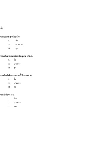 ความอุดมสมบูรณของดิน - ต่ํา L - ปานกลาง M - สูง H ความจุในการแลกเปลี่ยนประจุบวก (C.E.C.) - ต่ํา L - ปานกลาง M - สูง H ความอิ่มตัวดวยประจุบวกที่เปนดาง (B.S.) - ต่ํา L - ปานกลาง M - สูง H การหยั่งลึกของราก - งาย 1 - ปานกลาง 2 - ยาก 3