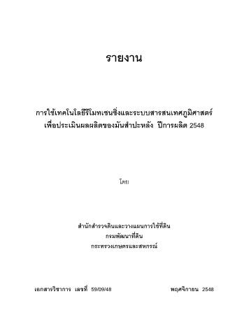 รายงาน การใชเทคโนโลยีรีโมทเซนซิ่งและระบบสารสนเทศภูมิศาสตร เพื่อประเมินผลผลิตของมันสําปะหลัง ปการผลิต 2548 โดย สํานักสํารวจดินและวางแผนการใชที่ดิน กรมพัฒนาที่ดิน กระทรวงเกษตรและสหกรณ เอกสารวิชาการ เลขที่ 59/09/48 พฤศจิกายน 2548