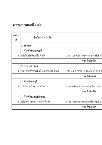 ตารางภาคผนวกที่ 2 (ตอ) ลําดับ ชื่อโรงงานแปงม ัน ที่ ภาคกลาง ี ุร 1. จังหวัดกาญจนบ ิษัทแปงมนเอเซีย จํากัด ั บร 1 ุร ี 2. จังหวัดราชบ ิษัทอุตสาหกรรมแปงมนบานโปง จํากัด ั บร 1 ุร ี 3. จังหวัดลพบ ิษัทลพบุรสตารช จํากัด ี บร 1 ุทรปราการ 4. จังหวัดสม ิษัทกรงเทพอาหารสัตว จํากัด ุ บร 1