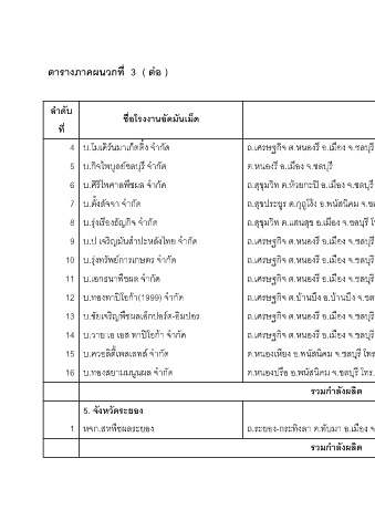 ตารางภาคผนวกที่ 3 ( ตอ ) ลําดับ ที่ บ.โมเดิร นมาเก็ตติ้ง จํากัด 4 ี ุ บ.กิจไพบ ูลยชลบร จํากัด 5 บ.ศิร ิไพศาลพืชผล จํากัด 6 บ.ตั้งส 7 ัจจา จํากัด ื บ.ร 8 ุงเรองธัญกิจ จํากัด ิญมันสาปะหลงไทย จํากัด ํ บ.ป เจร 9 ั ุงทรพยการเกษตร จํากัด บ.ร 10 11 บ.เอกธนาพืชผล จํากัด บ.ทองทาปโอกา(1999) จํากัด 12 บ.ชัยเจร 13