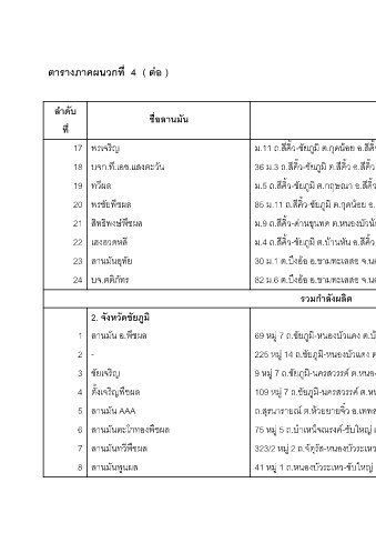 ตารางภาคผนวกที่ 4 ( ตอ ) ลําดับ ชื่อลานม ัน ที่ ม พรเจร 17 ิญ ี.เอช.แสงตะวัน บจก.ท 18 ทวีผล 19 ืชผล พรชัยพ 20 ิทธิพงษพชผล ื ส 21 เฮงฮวดหลี 22 ัย ลานมันอุท 23 ัทร บจ.ตติภ 24 ัยภูม ิ 2. จังหวัดช ืชผล ลานมัน อ.พ 1 - 2 ิญ ชัยเจร 3 ิญพืชผล ตั้งเจร 4