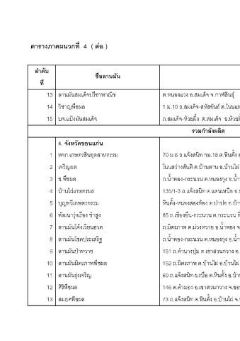 ตารางภาคผนวกที่ 4 ( ตอ ) ลําดับ ชื่อลานม ัน ที่ ลานมันสมเด็จปร ีชาพาณิช 13 วิชาญพืชผล 14 ั บจ.แป 15 งมนสมเด็จ 4. จังหวัดขอนแกน ินอุตสาหกรรม หจก.เกษตรส 1 ิญผล เจร 2 ืชผล ช.พ 3 านไผเกษตรผล บ 4 ุญทวีเกษตรกรรม บ 5 ัฒนารงเรอง ซําสง ู ื ุ พ 6 ลานมันโคงเวียนฮวด 7