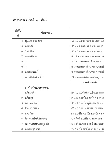 ตารางภาคผนวกที่ 4 ( ตอ ) ลําดับ ชื่อลานม ัน ที่ ุญเลศการเกษตร ิ บ 4 ลานรัศมี 5 ินธุ วิเศษส 6 ืชผล สหชัยพ 7 - 8 - 9 ลานมันพรทวี 10 งมนรอยเอด ็ ั บจ.แป 11 8. จังหวัดมหาสารคราม ็ง แตหมงเส 1 ุน แตฮะล 2 พรเทพพืชผล 3 ือ โรงสีขาวบรบ 4