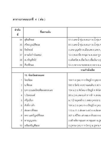 ตารางภาคผนวกที่ 4 ( ตอ ) ลําดับ ชื่อลานม ัน ที่ ุชินพืชผล ส 34 ีสมบูรณพชผล ื ศร 35 ิทธิพงษ อ 36 ันเลย2 ลานมันกําน 37 ิญพืชไร ส.เจร 38 ศีระพืชผล 39 10. จังหวัดสกลนคร ไทยนิยม 1 ืชผล น.พ 2 บจก.ยอแสงไทยพืชผลสกลนคร 3 ว.โชคอนงค 4 ีรงเรอง ื ุ ศร 5 ศักดิ