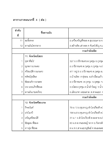 ตารางภาคผนวกที่ 4 ( ตอ ) ลําดับ ชื่อลานม ัน ที่ สะอิ้งทอง 11 ลานมันโคกกลาง 12 11. จังหวัดยโสธร ืชไร จุฑาพ 1 ยุภพการเกษตร 2 ีสมบัติการเกษตร ศร 3 ุงเรอง ื ทรัพยร 4 ชัยยนตการเกษตร 5 ืชผล บจ.วรรณกิจพ 6 ลานมันเกษตรไทย 7 ีสะเกษ 12. จังหวัดศร ันต กิจอน 1 เกงไมตร