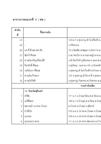 ตารางภาคผนวกที่ 4 ( ตอ ) ลําดับ ชื่อลานม ัน ที่ - 24 - 25 ี.เอส สตารช บจ.ซี.พ 26 ืชผล ชัยทวี พ 27 ิญศรสมบัติ ี ลานมันเจร 28 ืชผล จิระศักดิ์ พ 29 วงศประภาพืชผล 30 ลานมันเกียหมง 31 ลานมันกิตติ 32 ุรนทร ิ 13. จังหวัดส ทวีชัย 1 ีพชผล ื เมธ 2 ัวเชด สหกรณการเก