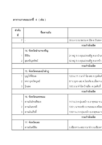 ตารางภาคผนวกที่ 4 ( ตอ ) ลําดับ ชื่อลานม ัน ที่ - 7 ํานาจเจรญ ิ 14. จังหวัดอ ิรสน ิ ิ ส 1 ิญทรัพย ฮุยเจร 2 ําภู 15. จังหวัดหนองบัวล ุญใหพชผล ื บ 1 ุดรไพบูลย หจก.อ 2 ุงแสง ร 3 16. จังหวัดนครพนม ลานมันรัตนพืชผล 1 ลานมันฮะหล ี 2 ลานมันเฮียตี๋ 3 17. จังหวัดเลย ถ ิ ลานมัน