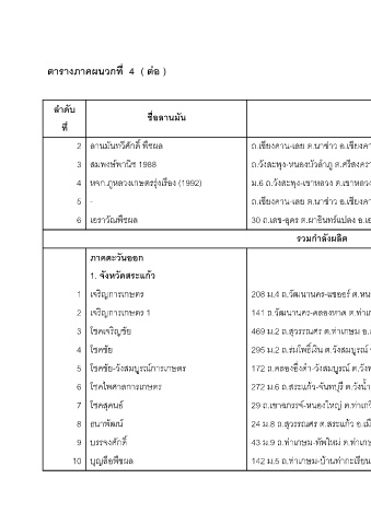 ตารางภาคผนวกที่ 4 ( ตอ ) ลําดับ ชื่อลานม ัน ที่ ืชผล ลานมันทวีศักดิ์ พ 2 สมพงษพานิช 1988 3 ูหลวงเกษตรรุงเรอง (1992) ื หจก.ภ 4 - 5 เอราวัณพืชผล 6 ภาคตะวันออก 1. จังหวัดสระแกว ิญการเกษตร เจร 1 ิญการเกษตร 1 เจร 2 โชคเจริญชัย 3 โชคชัย 4 ูรณการเกษตร โชคชัย-วังสมบ 5