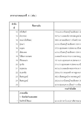 ตารางภาคผนวกที่ 4 ( ตอ ) ลําดับ ชื่อลานม ัน ที่ ทวีปศิลป 12 มังกรทอง 13 ืชผล ระเบาะไผพ 14 ุงนภา ร 15 ุดม ล.อ 16 ิศมงคล เล 17 วิเชียรการเกษตร 18 ิผองแผว ศิร 19 ศุภชัย 20 ุพรรณ ส.ส 21 ส.แสงชัย 22 ินสมบรณ ู ส 23 ินสมบรณ ู ส 24
